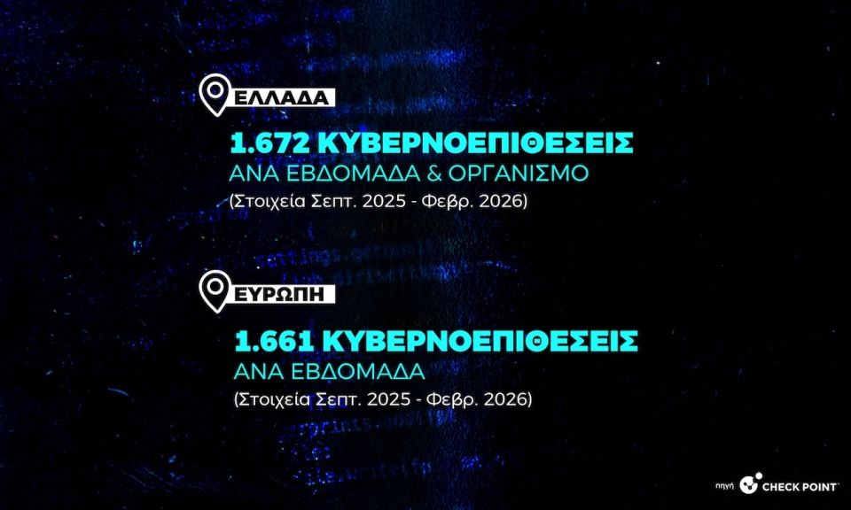 Σύμφωνα με τα πιο πρόσφατα στοιχεία της κορυφαίας εταιρίας κυβερνοασφάλειας Checkpoint για την Ελλάδα, το διάστημα Σεπτεμβρίου 2025 – Φεβρουαρίου 2026, ένας οργανισμός δέχθηκε κατά μέσο όρο 1.672 κυβερνοεπιθέσεις την εβδομάδα.